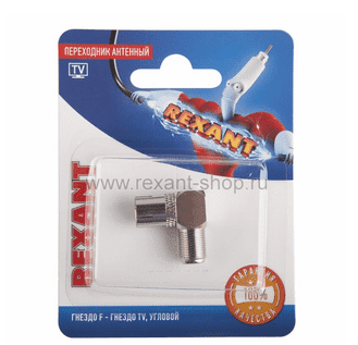 Rexant 06-0026-AПереходник предназначен для соединения коаксиального кабеля (с предварительно установленным F-разъёмом) с ТВ оборудованиями, такими как (розетки -ТВ, ресиверы, приставки DVB-T2, антенны-ТВ и т.д.). Отличительной особенностью переходника является угловая форма, что позволяет подключить кабель к оборудованию под прямым углом 90°. Изготовлен переход из никелированного металла, контакты выполнены с высокими антикоррозийными свойствами.