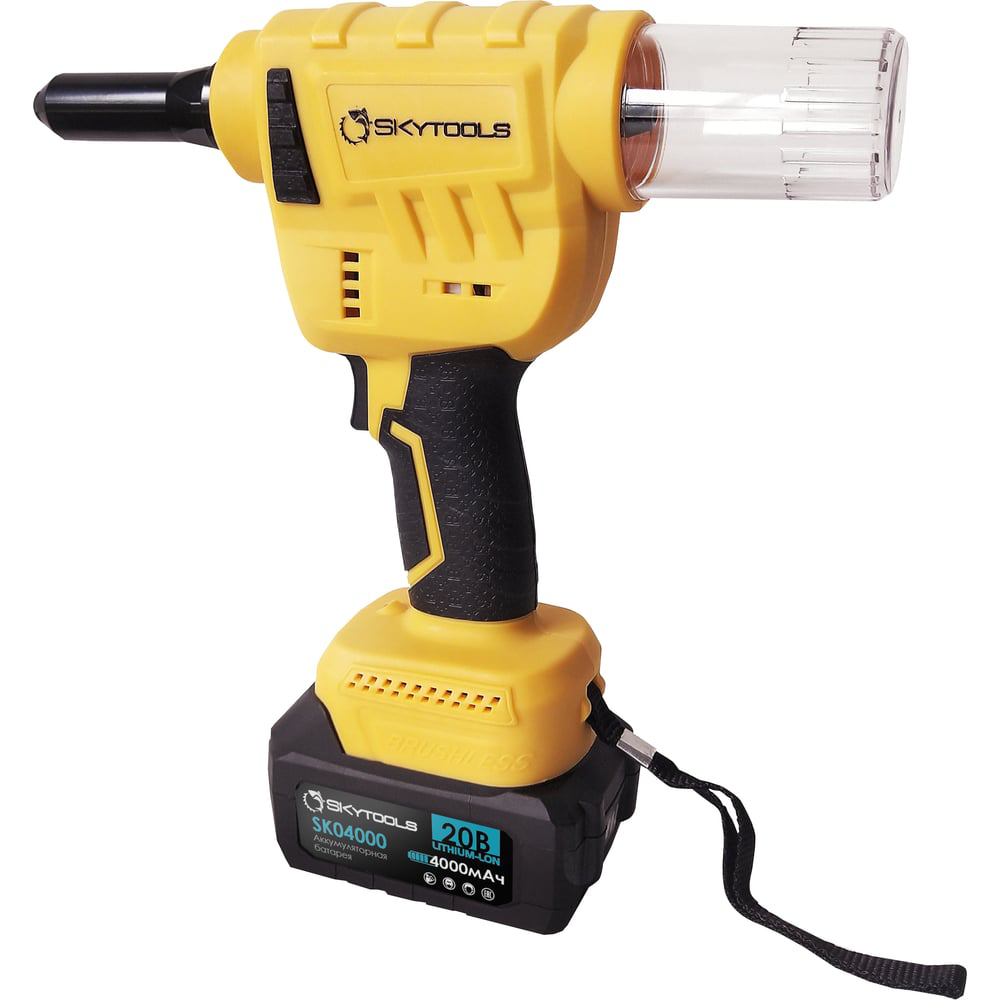 Аккумуляторный заклепочник SKytools SK64 используется для работы с заклепками из всех материалов, включая нержавеющую сталь. Имеет внушительную силу вытягивания в 15 000 Н. Аккумуляторная батарея взаимозаменяема с многими моделями ТМ SKytools: SK303 / SK126 / SK126-1 / SK129 / SK7005 / SK7006 / SK7007 / SK65 / SK9001-1 / SK9001 / SK9002-1 / SK9002 / SK9004 / SK9005. Долговечность. Бесщеточный двигатель увеличивает производительность инструмента и продлевает срок его службы. Прочность. Корпус изготовлен из ударопрочного пластика, благодаря чему устойчив к механическим повреждениям. Продолжительная работа. В комплект входят 2 аккумулятора, что обеспечивает длительную работу.