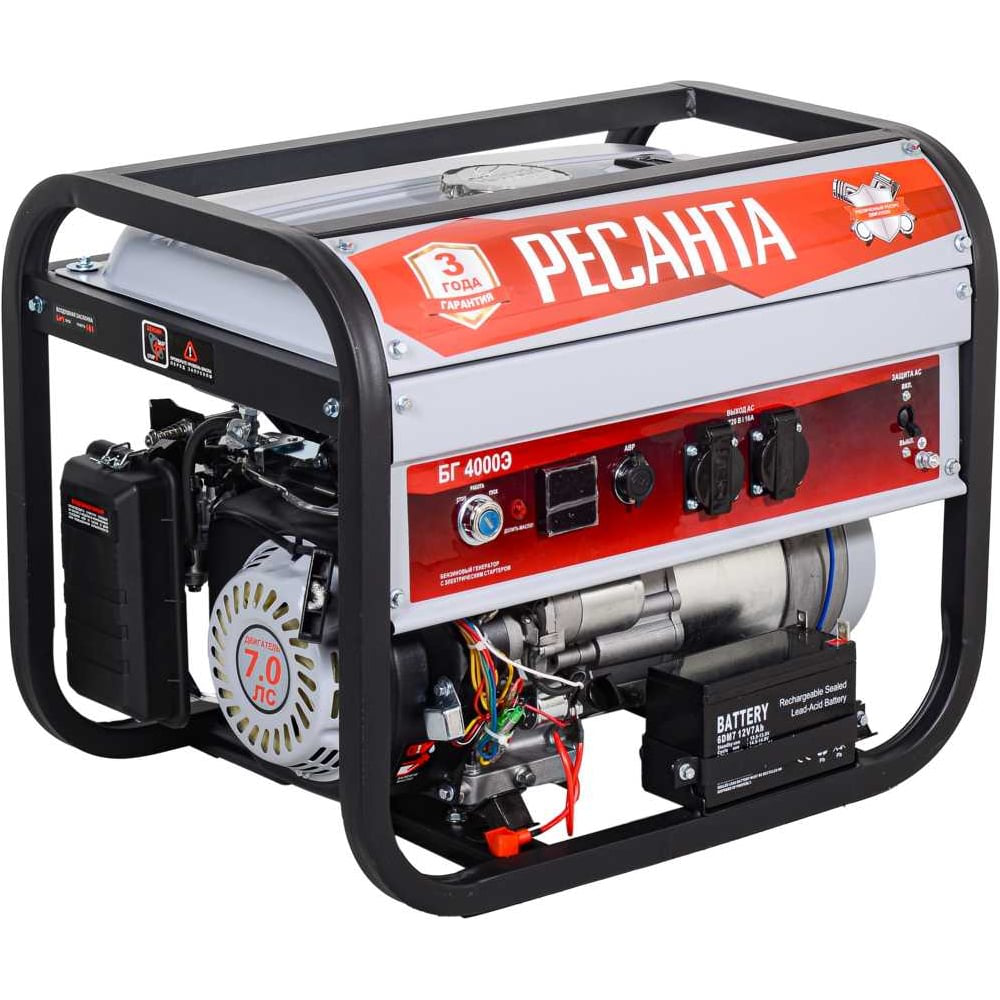 Переносной бензиновый генератор Ресанта БГ 4000Э используется для выработки электроэнергии в местах, где она временно или постоянно отсутствует. Устройство используется для временного электроснабжения небольших частных домов, дачных участков. Модель рассчитана на работу в повторно-кратковременном режиме, поэтому применяется только для бытовых нужд как резервный источник электроэнергии. Электрогенератор оснащен карбюраторным 4-хтактным одноцилиндровым ДВС, работает на неэтилированном бензине АИ-92. Электрозапуск двигателя обеспечивает электростартер с АКБ из комплекта. За счет максимальной мощности в 3300 Вт и 2-х встроенных розеток модель подойдет для подключения нескольких бытовых приборов. Емкости бака в 15 л достаточно для работы в течение нескольких часов. Бензогенератор встроен в усиленную несущую раму из гнутой квадратной трубы, оснащен съемными резиновыми опорами, снижающими вибрацию. На лицевой стороне устройства установлен многофункциональный прибор с цифровой индикацией напряжения, частоты тока, счётчика моточасов. Достоинства модели Ресанта БГ 4000Э: защита от КЗ и перегрузки; защита от недолива и отсутствия масла.