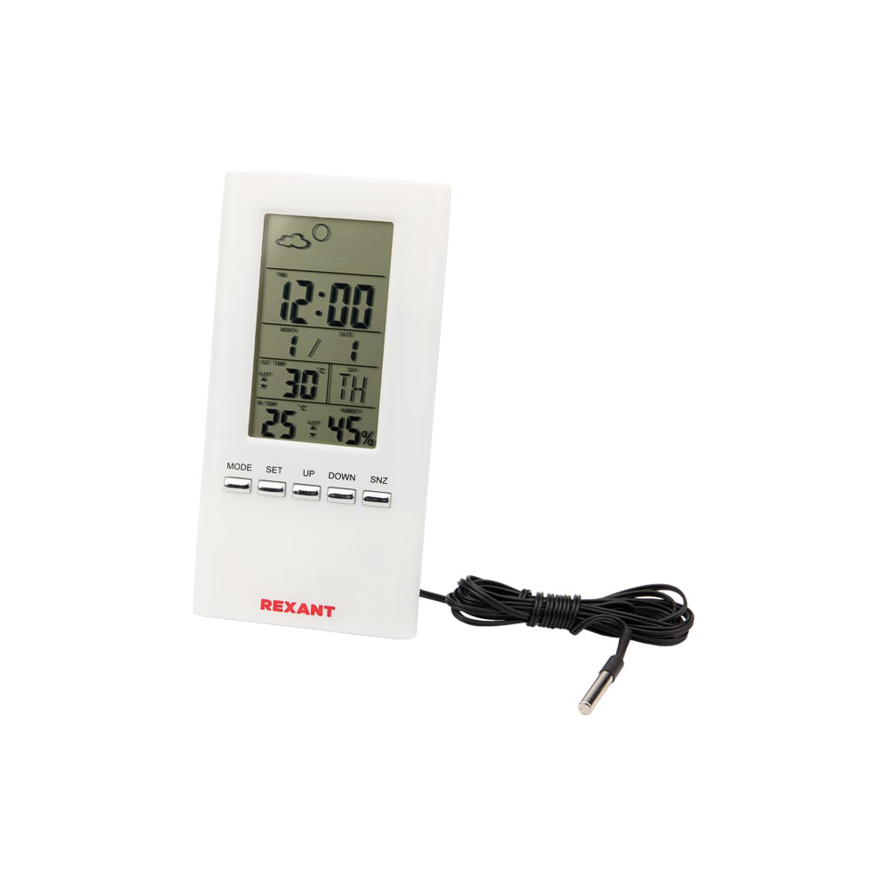 Метеостанция с выносным датчиком REXANT S3331SC 70-0513 предназначена для измерения показаний температуры в помещении и на улице, комнатной влажности, имеет часы, календарь, функцию будильника и прогноза погоды. Регистрирует в памяти максимальное и минимальное значения температур. Отображает общий уровень метеокомфорта в помещении. Технические характеристики: Отображение температуры в помещении и на улице, отображение влажности в помещении Отображение времени Единица измерения температуры С/F изменяемая Память максимального / минимального значения температуры 2 режима отображения времени: 12ч / 24ч Ежедневная функция будильника Стимулирующий прогноз погоды Диапазон температур: Температура в помещении: 0 С + 50 С Температура наружного воздуха: -40С +70 С Диапазон влажности: в помещении 20% RH 90% RH Блок питания: AG10 x1 (в комплекте)