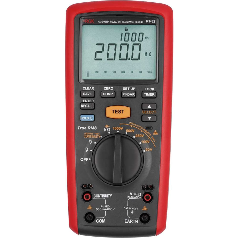 Цифровой мегаомметр RGK RT-32 используется для измерения сопротивления изоляции, оценки ее состояния и определения различных электротехнических параметров. Приборы такого типа востребованы при проведении диагностики и техобслуживания промышленного оборудования, электросетей, а также при работах, связанных с системами электрического обогрева полов в жилых или коммерческих объектах.Ключевые отличия от младшей моделиПо сравнению с RT-30 были существенно расширены возможности, напрямую не связанные с инфекциями изоляционных материалов. К режимам прозвонки и замера напряжения добавились функции определения частоты тока, емкости конденсаторов и тока утечки. Кроме того, в этой модификации расширен рабочий диапазон измерения сопротивления. Благодаря такому функционалу измеритель сопротивления изоляции RGK RT-32 может частично заменить мультиметр.Возможности прибораРасчет индекса поляризации PI.Измерение коэффициент абсорбции DAR.Выбор тестового напряжения.Настройка продолжительности замера сопротивления изоляции.Звуковая сигнализация окончания тестирования.Память на 99 значений и функция сравнения показаний.Полезные особенности электронного мегаомметра RGK RT-32Дополнительная графическая шкала.Фиксация показаний на дисплее.Яркая подсветка экрана и рабочей зоны.Удобная подставка, которая освобождает руки при работе.Полный комплект - батарейки, провода, щупы, зажимы, транспортировочный чехол.