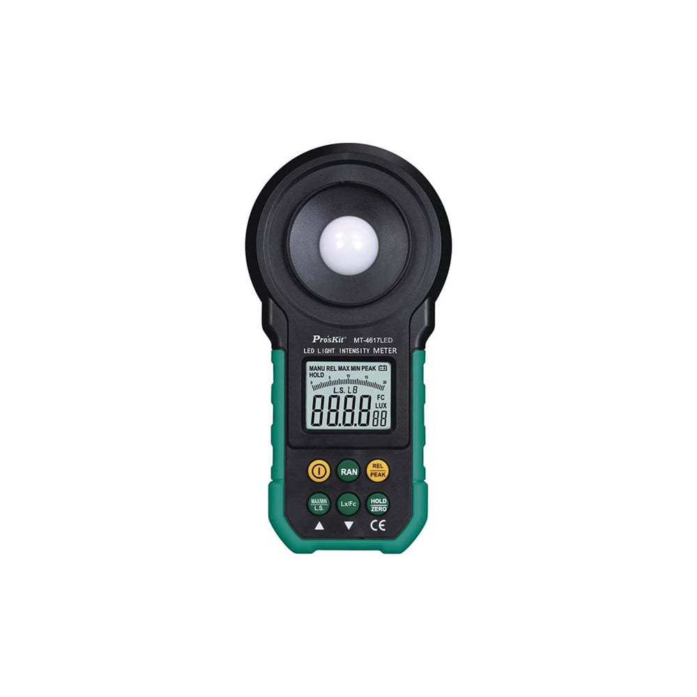Люксметр ProsKit MT-4617LED – это цифровой портативный прибор для замеров света от любых излучателей. С его помощью можно проверять светодиоды любых спектров, люминесцентные, натриевые, галогенные лампы и даже лампочки накаливания. Особенности встроенный корректирующий фильтр; измерение в двух режимах – автоматическом и ручном; удобный дисплей с четким отображением информации; наличие индикации низкого заряда; автоматическое выключение при бездействии; встроенная память; калибровка и персональные настройки; внушительный диапазон измерения 200 тыс люкс / 20 тыс фут.