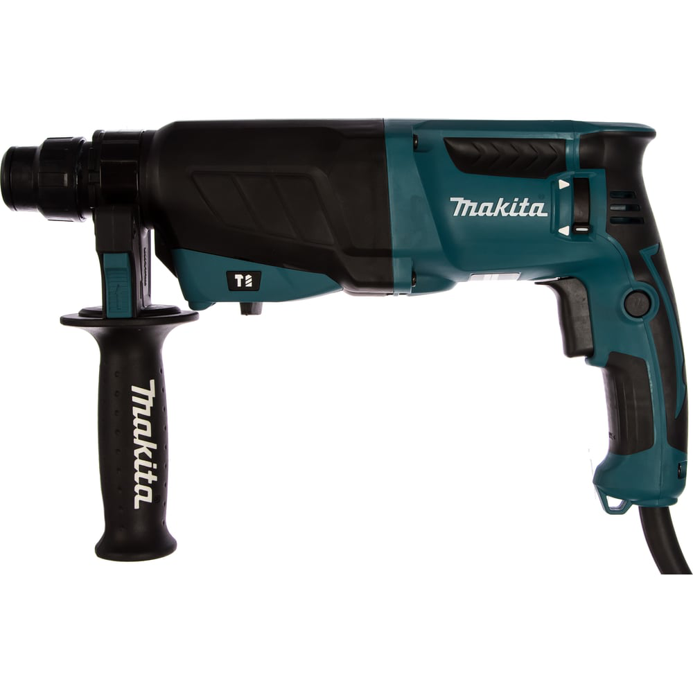 Перфоратор Makita HR2630 оснащен патроном SDS-plus, что способствует быстрой и простой замене оснастки. Функция реверса реализована поворотом щеток, что продлевает их срок службы. Клавиша фиксации кнопки "Пуск" в положении старт упрощает ведение продолжительной по времени работы. Модель имеет три режима работы: сверление, сверление с ударом и долбление. Сила удара - 2.4 Дж (по методике EPTA).
