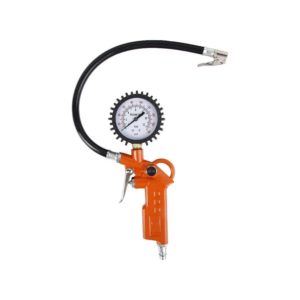 Gневматический пистолет для накачки автомобильных шин и проверки давления. Рабочее давление 1-8 бар. Быстросъемный адаптер ЕВРО для подключения к компрессору Пистолет легкий (0,5 кг) и компактный, его удобно возить с собой в автомобиле Встроенный манометр для визуального контроля давления Кнопка сброса избыточного давления Прочность Металлический корпус устойчив к механическим повреждениям Манометр помещен в прорезиненный кожух, защищающий при падении Рабочие детали из латуни не ржавеют и практически не изнашиваются