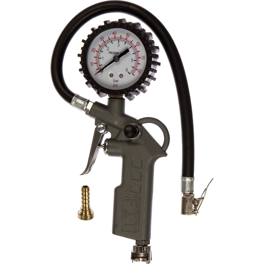 Пистолет с манометром FIT 81045 применяется для накачивания шин и прочих емкостей воздухом. Благодаря большому манометру можно проследить за уровнем остаточного давления в шинах. Инструмент имеет измерительную шкалу до 6 атмосфер и шаг равный 0.1 атмосфер. Корпус выполнен из алюминия, благодаря чему обладает прочностью и устойчивостью к механическим повреждениям.