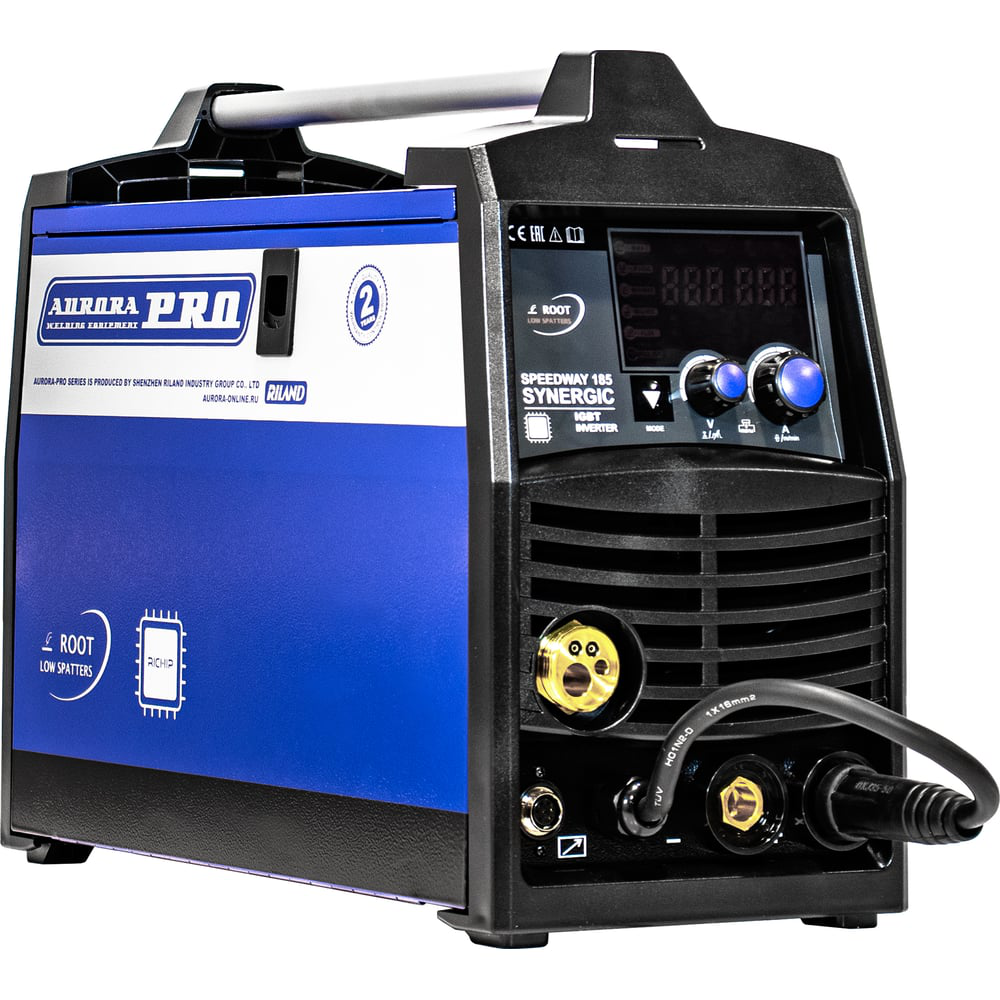Сварочный полуавтомат AuroraPRO SPEEDWAY 185 RICHIP(MIG/MAG+MMA+TIG lift) - это новая модель линейки профессиональных инверторных полуавтоматов AuroraPRO. Данный аппарат используется для работы с чёрной сталью MIG/MAG, для полуавтоматической сварки порошковой самозащитной проволокой NO GAS, для ручной дуговой сварки штучным электродом MMA, а также для аргонно-дуговой сварки на постоянном токе TIG DC. Полуавтомат наделен синергетическим управлением параметрами сварки с помощью всего одной рукоятки с возможностью моментальной коррекции напряжения дуги и индуктивности. К аппарату возможно подключениеSpool GUN-горело с помощью специального разъёма. Процессор RICHIP с тактовой частотой 72кГц позволяет повысить качество выходного тока инвертора и ускорить его обратные связи. Главная особенность полуавтоматов серии SYNERGIC заключается в специальном режиме ROOT, который позволяет добиться снижения числа и энергии сварочных брызг в сравнении с обычными полуавтоматами. Данный режим, используя чистую углекислоту в качестве защитного газа, позволяет добиться отличного внешнего вида шва и глубокого проплавления, а также избежать затрат на последующую обработку околошовных зон. Процесс ROOT снижает число брызг на 30-50 %. Особый характер переноса электродного металла, получаемый благодаря сложной форме импульса переноса, позволяет сварщику, даже с небольшим опытом, формировать гладкие, прочные и абсолютно ровные швы без «чешуи». Стыки после сварки выглядят как отлитые на производстве.