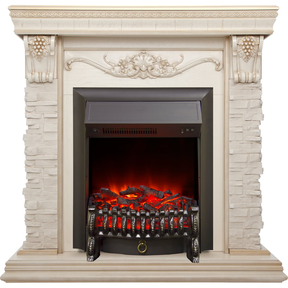 Каминокомплект RealFlame PATRICIA STD/EUG WT FOBOS BL - небольшой пристенный камин с элементами замкового стиля. Скалистая фактура камня выгодно сочетается со шпонированными элементами цвета "белый дуб с бежевой патиной". Легким украшением обрамления служат рельефные капители с растительным декором. Благодаря изысканному сочетанию цветов и природных фактур камин подойдет как в традиционный, так и более современный интерьер.В состав входит стандартный электроочаг FOBOS BL.Очаг с функцией обогрева. 2 уровня регулировка мощности обогрева. Мощность обогрева: 0,75/1,5 кВт.Регулировка яркости пламени, Таймер отключения, Защита от перегрева, Звуковой эффект.Внутреннее стекло - зеркальное. Отличительная зеркальная задняя стенка очага позволяющая улучшить эффект имитации пламени.Оригинальность дизайна достигается литой чугунной решеткой, имитирующей колосник и внешней рамкой с небольшим капором.Благодаря задней зеркальной стенке создается эффект объемного пламени и дополнительной игры света и тени.Звук потрескивающих дров и наличие обогрева усиливает сходство с настоящим очагом.Очаг с функцией обогрева. 2 уровня регулировка мощности обогрева. Мощность обогрева: 0,75/1,5 кВтГабариты очага: 610х503х290 ммВстраиваемые: 555х405х140 ммУстановка в портал: снаружиМуляж: дроваТип ламп: диодныйВнутренняя стенка: зеркальнаяКорпус: черныйОсобенности: без внешнего стекла, литая чугунная решеткаЗащита от перегреваРегулировка яркости пламениЗвуковой эффект