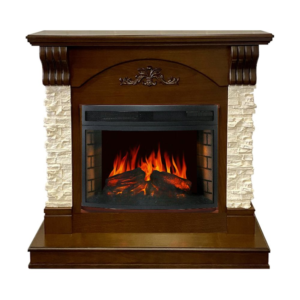 Каминокомплект выполнен в строгом классическом стиле. Главный акцент в оформлении сделан на контрастном сочетании дерева и камня, имитирующего натуральный. Топка очага выложена кирпичной кладкой, за счет чего выглядит более натурально. Игра огня, реализованного с помощью специальной подсветки, а мерцающая светодиодная поленница усиливает его эффект. Также в очаге воссоздана звуковая имитация потрескивания горящих дров.