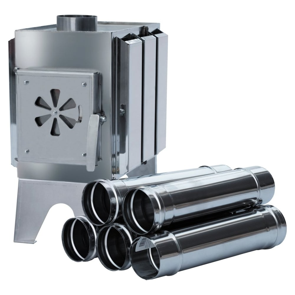 Мобильная печь НМК "Турист" 060015 НМК060015 предназначена для обогрева передвижных сборно-разборных конструкций, палаток, а также мобильных бань и саун. Печь выполнена полностью из нержавеющей стали марки AISI 430, толщиной от 0,5 мм до 1,5 мм в зависимости от тепловой нагрузки ее элементов. Печи является экономичным и высокоэффективным отопительными аппаратом, которая работает на твердом топливе: дрова, прессованные деревянные брикеты. Режим работы задается потребителем самостоятельно и зависит от величины и скорости достижения требуемой температуры в отапливаемом помещении. Нагретый воздух равномерно отапливает обогреваемый объем с помощью воздуховодов, расположенных на корпусе печи.