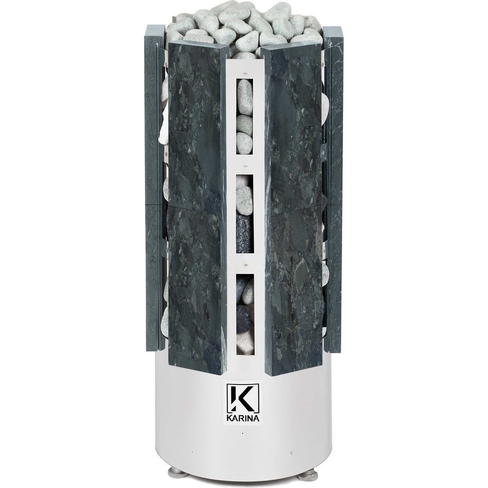 Электрокаменка Karina Forta 8 Онего Грин выполнена в напольном варианте, цилиндрической формы дополненной плитами из натурального камня Онего Грина. Напряжение питания - 220/380В. Данная модель имеет 3 тэна, расположенных в виде треугольника. В центре внизу расположен бак для воды емкостью 3 л, является парогенератором. Выше парогенератора имеется емкость под мелкие камни или нержавеющие шары объемом 2.5 л, вмещающая 5 кг мелкого камня, это закрытая каменка с воронкой для подачи воды и получения мелкодисперсного пара. Электрическая печь Karina Forta 8 Онего Грин многофункциональна и подойдет для любителей как финской сауны, так и русской бани.Если в парогенератор не заливать воду, то каменка разогреет парную до высокой температуры (100 -120°C) с относительной влажностью воздуха 10-12% - режим сухой бани (финская сауна). Если залить воду в парогенератор, то при разогреве парной вода будет испаряться и увлажнять воздух до режима русской бани (60-70°C и 40-50% влажности). В обоих случаях возможно использование закрытой каменки, которая дополнительно прибавит мелкодисперного необжигающего пара.Все корпусные элементы печи выполнены из нержавеющей стали. Нагревательный элемент - ТЭН диаметром 10мм. Наружный кожух каменки дополнительно облицован плитами из Онего Грина толщиной 40мм, что придает ей еще большую теплоемкость и меньшее излучение от металлических элементов, которые выжигают воздух в парной. Общий вес камней составляет 160кг (загрузка печи 100кг и вес облицовки 60кг).