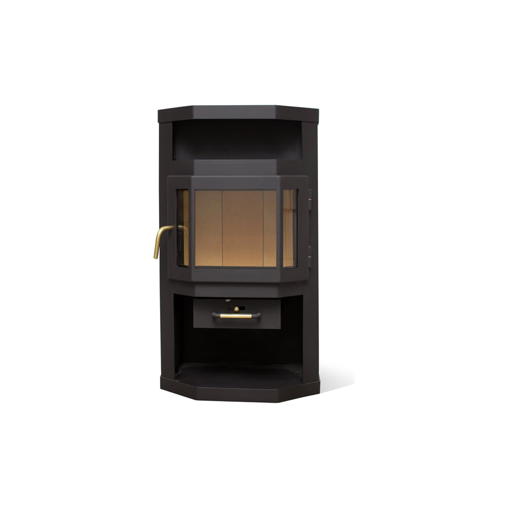 Компактная пристенная печь. Верхняя панель оборудована чугунной варочной плитой. Идеально подходит для обогрева небольшого загородного домика площадью 30-60 м2. Призматическая дверка высотой 310 мм. В отделке боковых поверхностей используется керамическая плитка. Кроме обогрева помещения можно разогреть пищу или вскипятить чайник. Размер поленьев 25 -27 см. Подсоединение к дымоходу сзади.