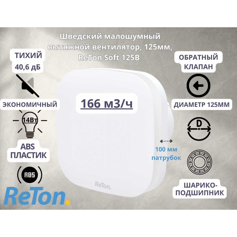 Вытяжной малошумный шведский вентилятор диаметром 125 мм - Reton Soft 125B для ванной комнаты это сочетание скандинавского дизайна и высокого качества. Расход воздуха: 166 м3/ч. Корпус вентилятора из высокопрочного ABS-пластика. Вентилятор имеет декоративную полукруглую форму лицевой панели, что позволяет его сочетать как в интерьере с круглыми, так и с квадратными формами. Обратный клапан мембранного типа является простым, но функциональным: мембрана из полимерной пленки выполняет свои функции и не дает запахам проникать в помещение, а также, благодаря своей конструкции и легкости, клапан не издает хлопающих звуков при закрывании. Под обратным клапаном находится рассекатель потока воздуха для создания мощного и равномерного воздушного потока. Диаметр вентилятора 115 мм, глубина патрубка 100мм. Корпус вентилятора, лицевая панель и лопасти изготовлены из качественного ударопрочного АБС-пластика с добавкой антистатика для защиты от пыли. Установка: Подходит для потолочного или настенного монтажа. Устанавливается непосредственно в вентиляционный канал. Вентилятор предназначен для установки в ванных комнатах, санузлах, кухнях, жилых, офисных и общественных помещениях. Согласно правилам эксплуатации, вентилятор не должен быть использован до полного окончания строительных работ. Подключение: Вентилятор подключается к электросети 230В переменного тока. Подключение производится по двухпроводной схеме (L и N). Управляется внешним выключателем (например, выключателем света).