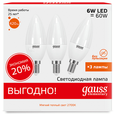 В нашем магазине «Главэлектрика» в Москве, вы можете приобрести товар: «Gauss LED Elementary Candle 6W E14 2700K/3000К (3 шт. в уп.)» с доставкой по г. Москва.
