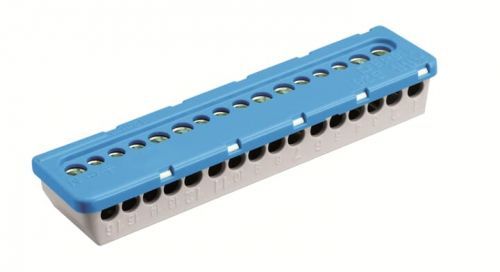 Винтовой клеммный блок нейтраль N9x16-12х6мм для боксов фирмы ABB серии MistralКлемный блок предназначен для коммутации жил проводов и кабелей, а также для соединения нулевого провода и провода заземления. Клеммные блоки выполнены в интуитивно понятных цветах: нейтраль (N) – синий, земля (PE) – зелёный. Клеммы могут устанавливаться как сверху шкафов – так и снизу.