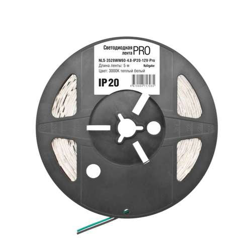 Светодиодная лента Navigator IP20 12V 4.8Вт/м 3000К NLS-3528WW60 серия PRO СД (5м), 71703 поставляется в рулоне длиной 5 метров, что обеспечивает достаточно материала для использования в различных проектах. Вы можете легко установить ее на любую поверхность благодаря клейкой основе на обратной стороне ленты.