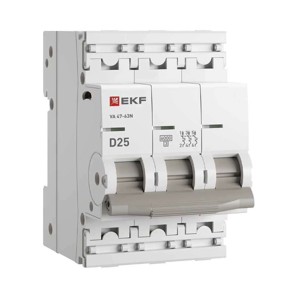 Автоматический выключатель EKF 3P 25А (D) 6кА ВА 47-63N PROxima M636325D - это компактный прибор, позволяющий осуществлять ручное отключение и включение управляемых им участков цепи и обеспечивающий защиту элетросети от короткого замыкания и перегрузки. Устанавливается в настенном щите или напольном шкафу на DIN-рейку. Конструкция модели автоматического выключателя дает возможность подключать дополнительные контролирующие, управляющие и обслуживающие устройства.