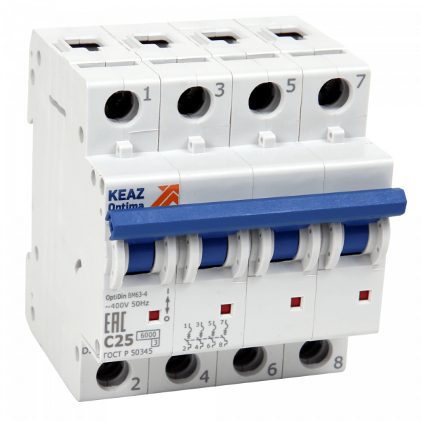 Модульный автоматический 4 полюсный выключатель переменного тока с предельной коммутационной способностью при переменном токе 6 кА на номинальный ток 2 А .