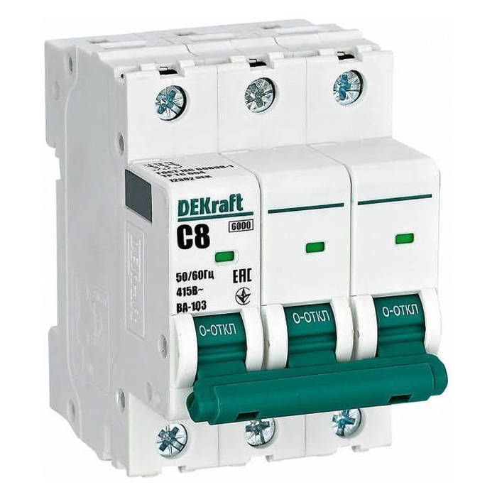 DEKraft ВА-103 3P 8А (C) 6кА, 12302DEK - это надежное и функциональное устройство, которое обеспечивает защиту электрических цепей от перегрузок и короткого замыкания, а также предотвращает возможные аварийные ситуации.