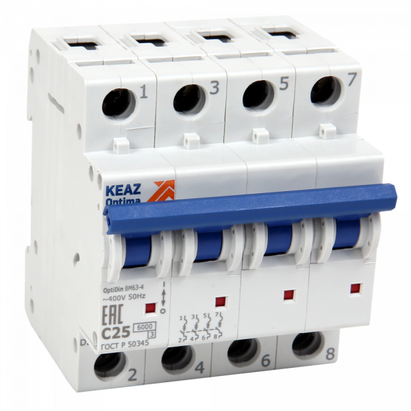 Модульный автоматический 4 полюсный выключатель переменного тока с предельной коммутационной способностью при переменном токе 6 кА на номинальный ток 20 А .