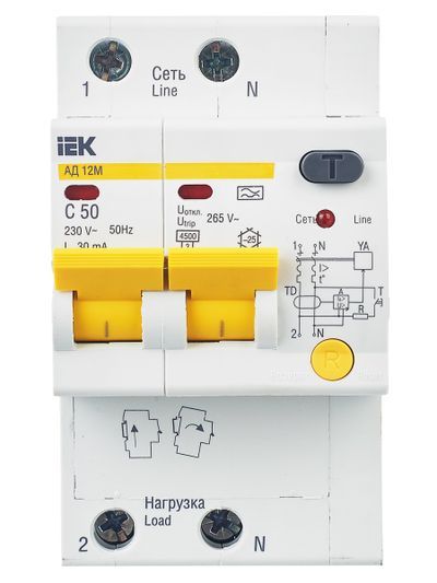 Быстродействующие защитные выключатели обеспечивают: в исполнении с уставками срабатывания 10 и 30 мА: - защиту людей от поражения электрическим током при прямом непреднамеренном прикосновении к токоведущим частям электрооборудования; в исполнении с уставками срабатывания 100 и 300 мА: – защиту от пожара из-за возгорания изоляции токоведущих частей; – защиту от перегрузки и короткого замыкания; – защиту от недопустимого повышения напряжения сети (АД12М). В изделиях предусмотрена индикация срабатывания от дифференциального тока, а для АД12М также светодиодная индикация включенного состояния. АД12М сохраняет работоспособность при снижении напряжения электрической сети до 110 В. В качестве коммутационных аппаратов в изделиях использованы выключатели автоматические ВА47-29 новой серии.