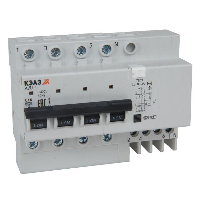 Автоматический выключатель дифференциального тока на номинальный ток 63 А и номинальный отключающий дифференциальный ток 30 мА.