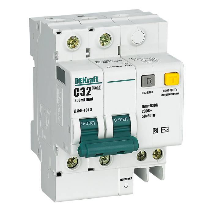 Дифавтомат DEKraft ДИФ-101 2P 32А (C) 6 кА, 300 мА (S), 15306DEK - это двухполюсный автоматический выключатель, предназначенный для защиты электрических цепей от перегрузок и коротких замыканий.Он имеет номинальный ток 32А и выдерживает ток короткого замыкания до 6 кА.