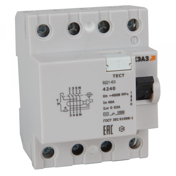 Четырехполюсное устройство защитного отключения на номинальный ток 63 А, номинальный отключающий дифференциальный ток 300 мА и рабочее напряжение переменного тока 400 В.