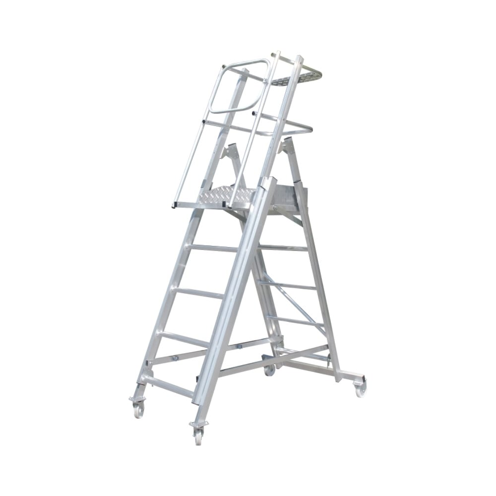 Телескопическая лестница-платформа MEGAL ТЛП-К (1.6-2.5) 4687201843870 предназначена для работ в торговых залах, на складах, вдоль стеллажей и других объектов, при проведении ремонтных, монтажных и иных работ. Конструкция выполнена из алюминиевых профилей высокой прочности, что гарантирует надежность. Противоскользящие ступени из специального эксклюзивного рифленого профиля обеспечивают безопасный подъем/спуск. Мягкие колеса (диам. 125 мм) позволяют без усилий перемещать лестницу-стремянку в пределах рабочей зоны. Лестница имеет два поворотных колеса с тормозом фиксаторов и два неповоротных. Все соединительные узлы и элементы полностью безопасны, обработаны и одобрены службой контроля качества. Обратите внимание! Количество ступеней не соответствует представленному на фото.