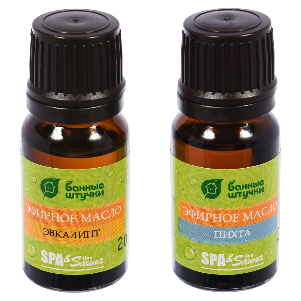 Набор эфирных масел Банные Штучки эвкалипт и пихта, 2 масла по 10 мл в блистере в форме капли 20 32289 используются в бане, в сауне или в ванной. В разогретом воздухе масла усиливают свое воздействие, хорошо влияют на кожу и облегчают дыхание.