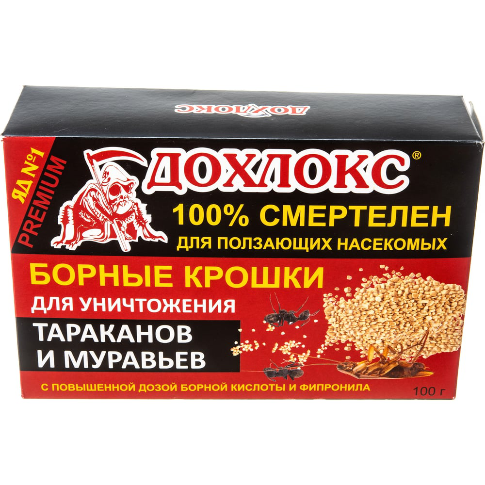 Борные крошки от тараканов и муравьёв Дохлокс 100 г 22009 размещаются на подоконниках, полу, плинтусах, в сантехнических шкафах. Являются сухими пищевыми приманками с повышенным содержанием яда. Наиболее удобны для поедания насекомыми. Упакованы в удобную для использования коробку.